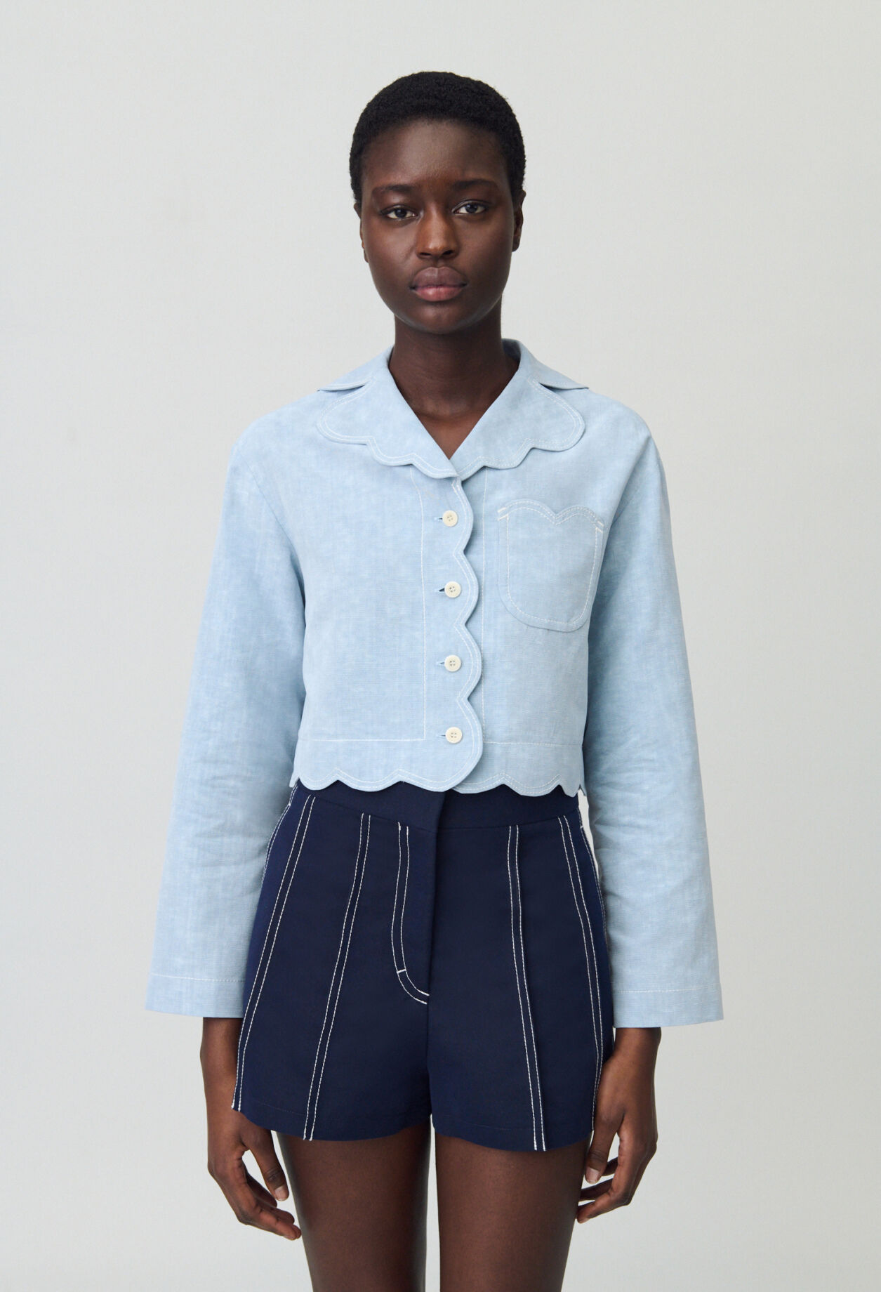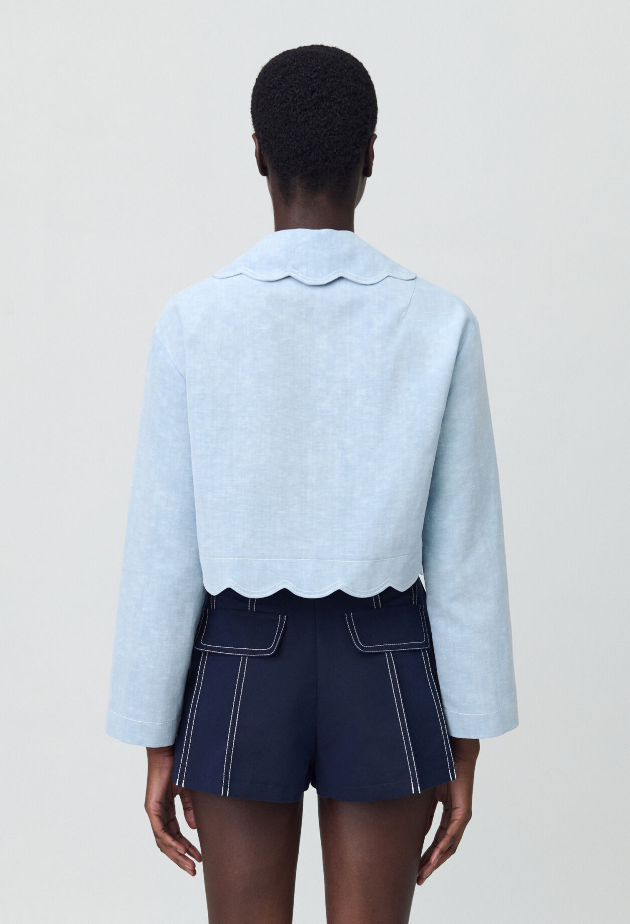 Chemise cropped à manches longues et col tailleur avec surpiqures contrastées