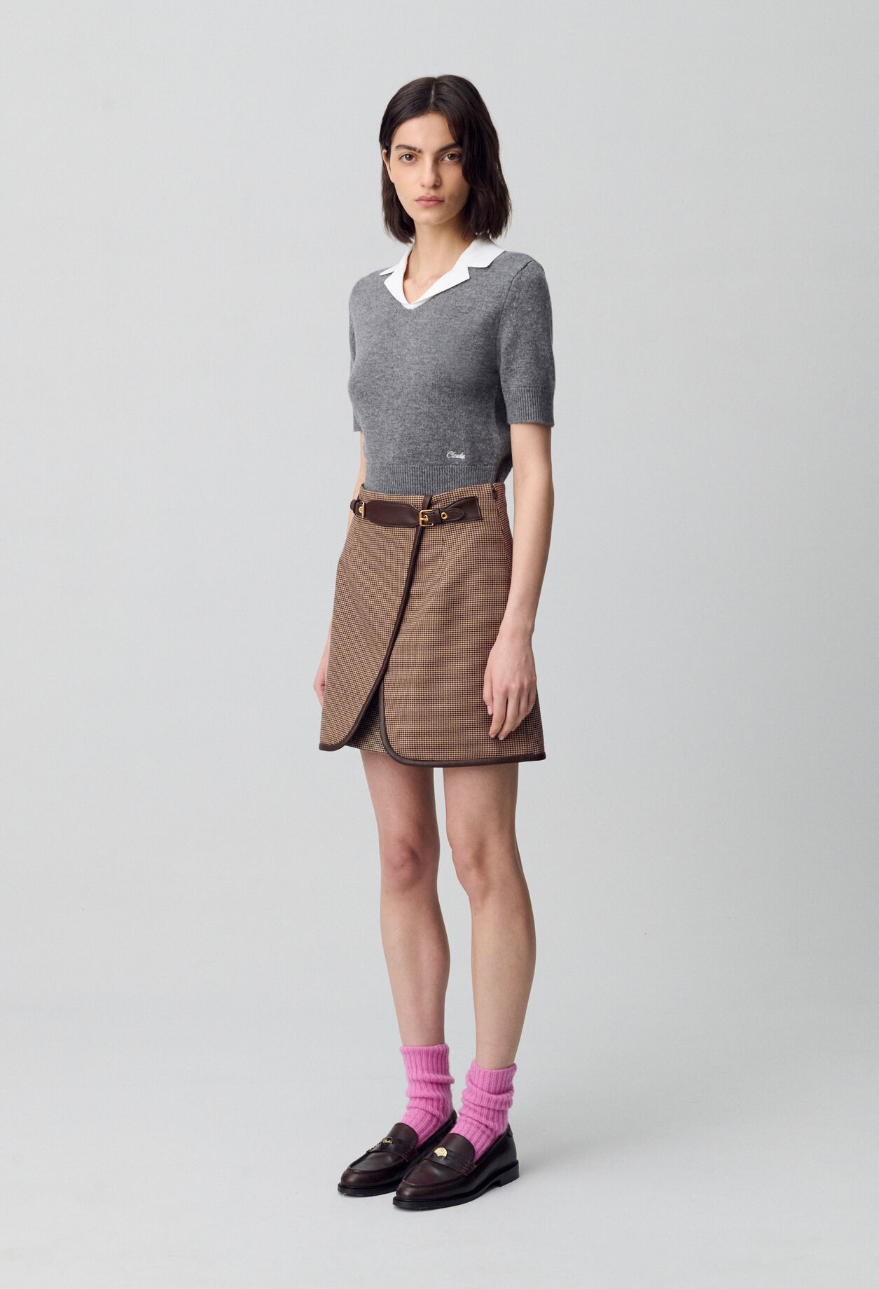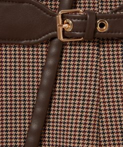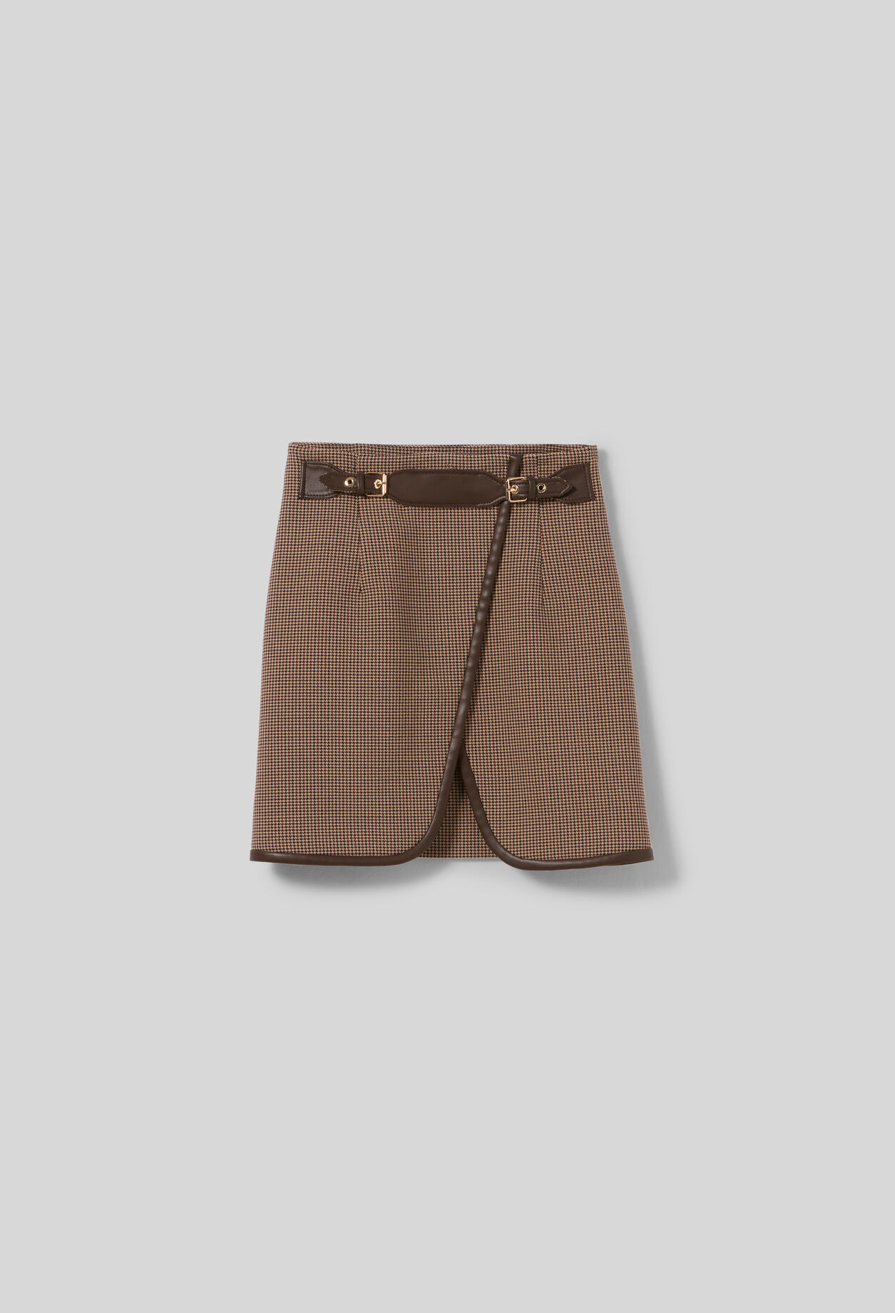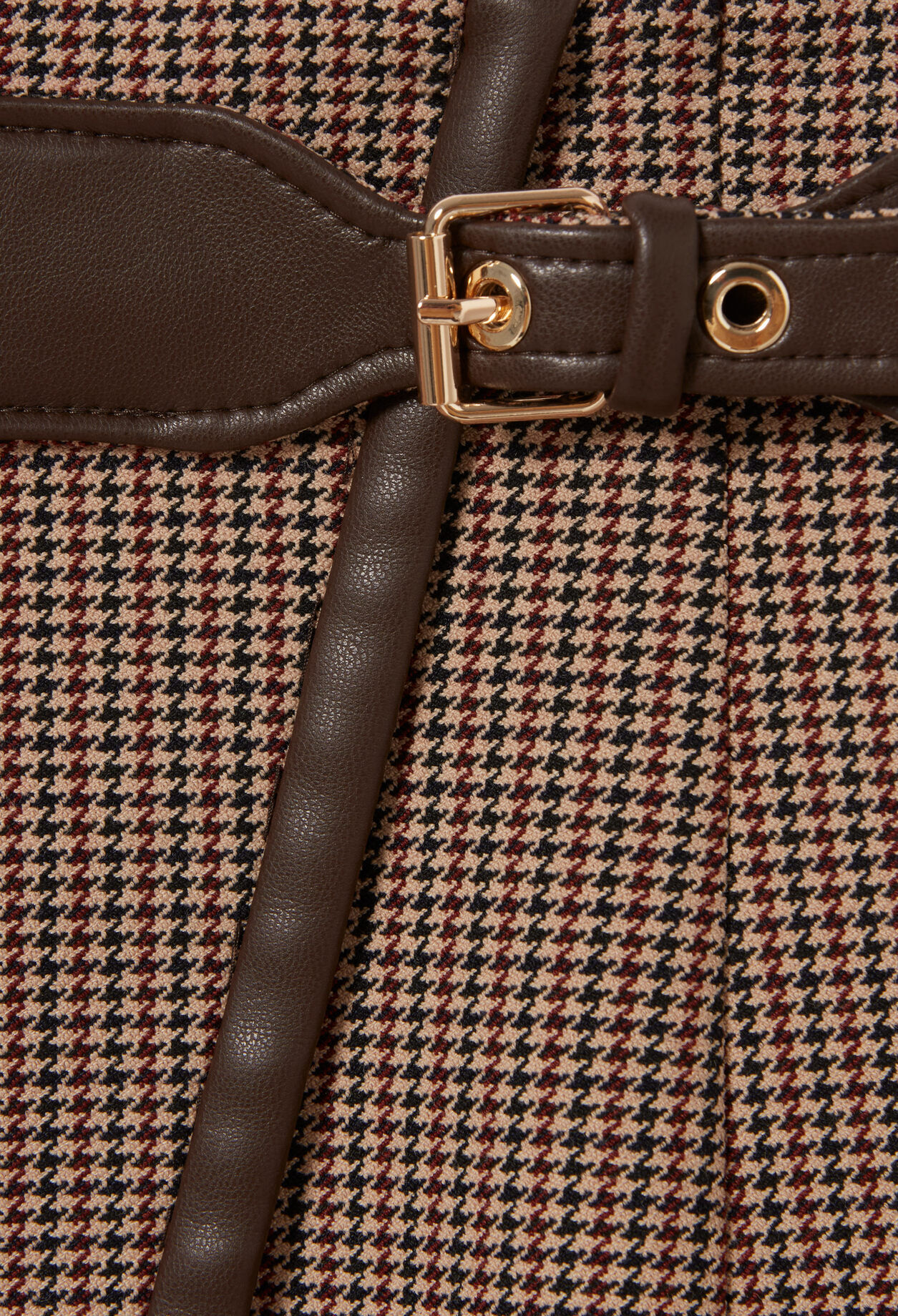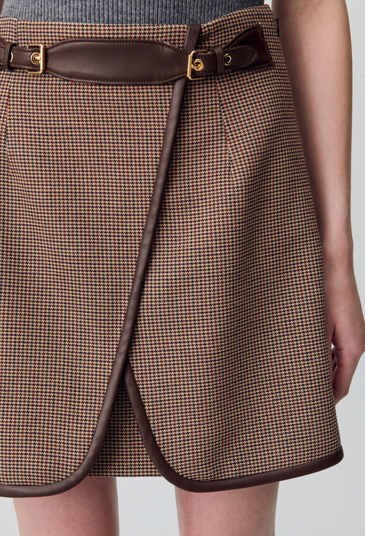 Jupe courte à motifs pied de poule avec patte en faux cuir et coupe droite portefeuille