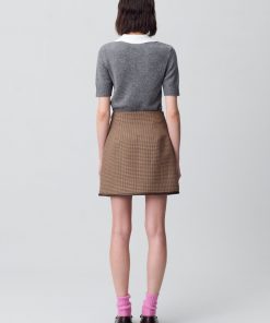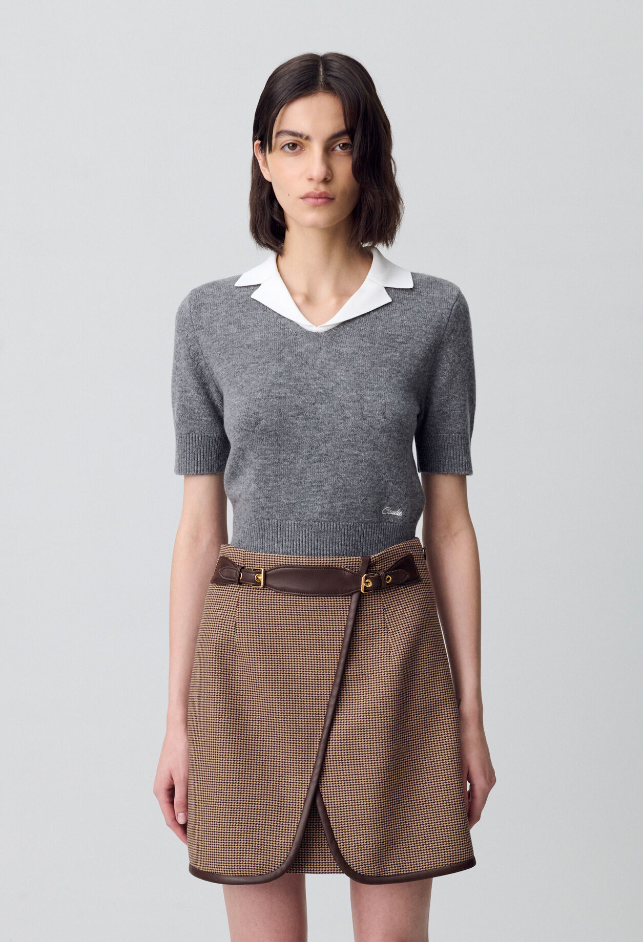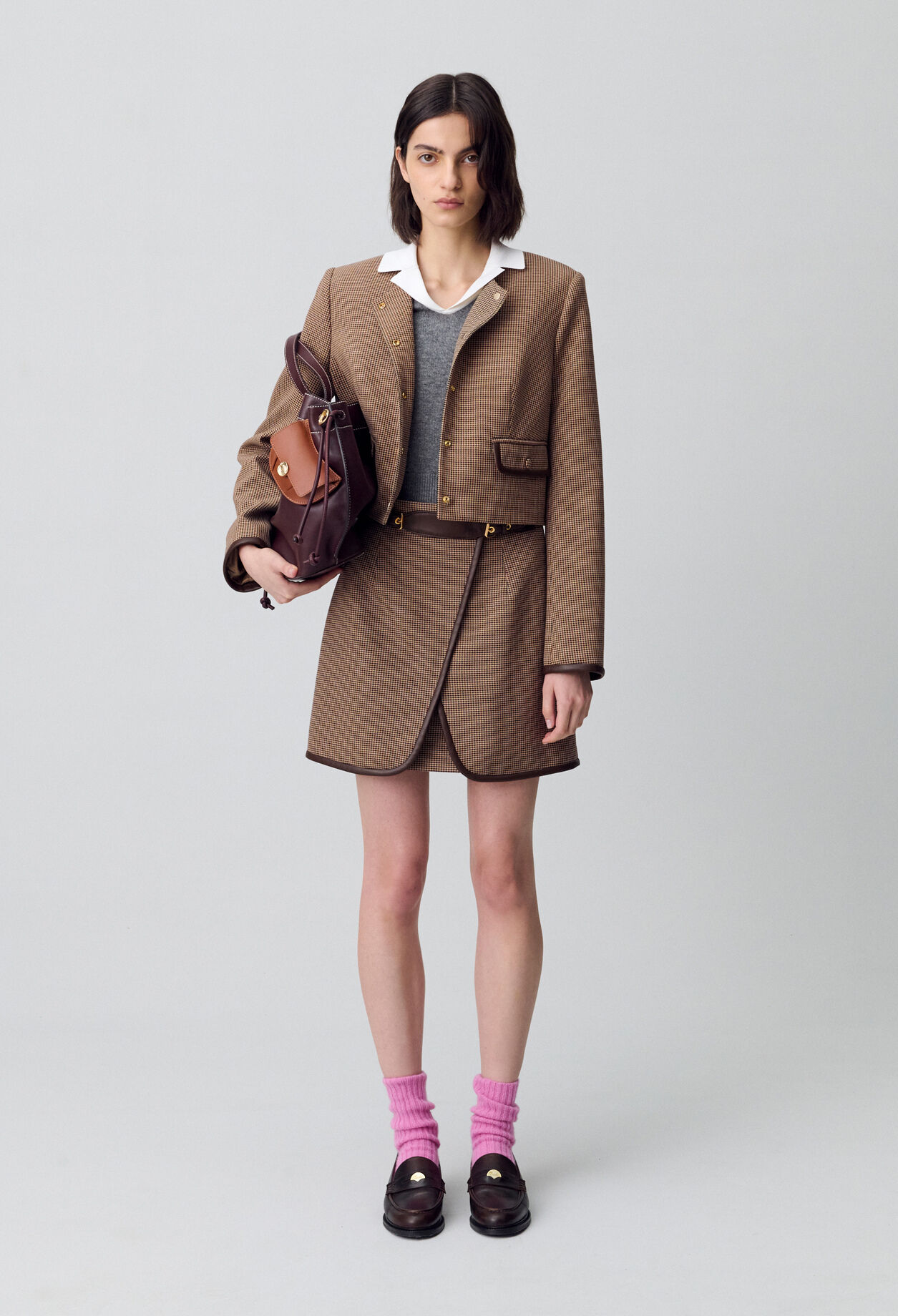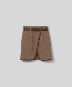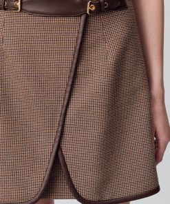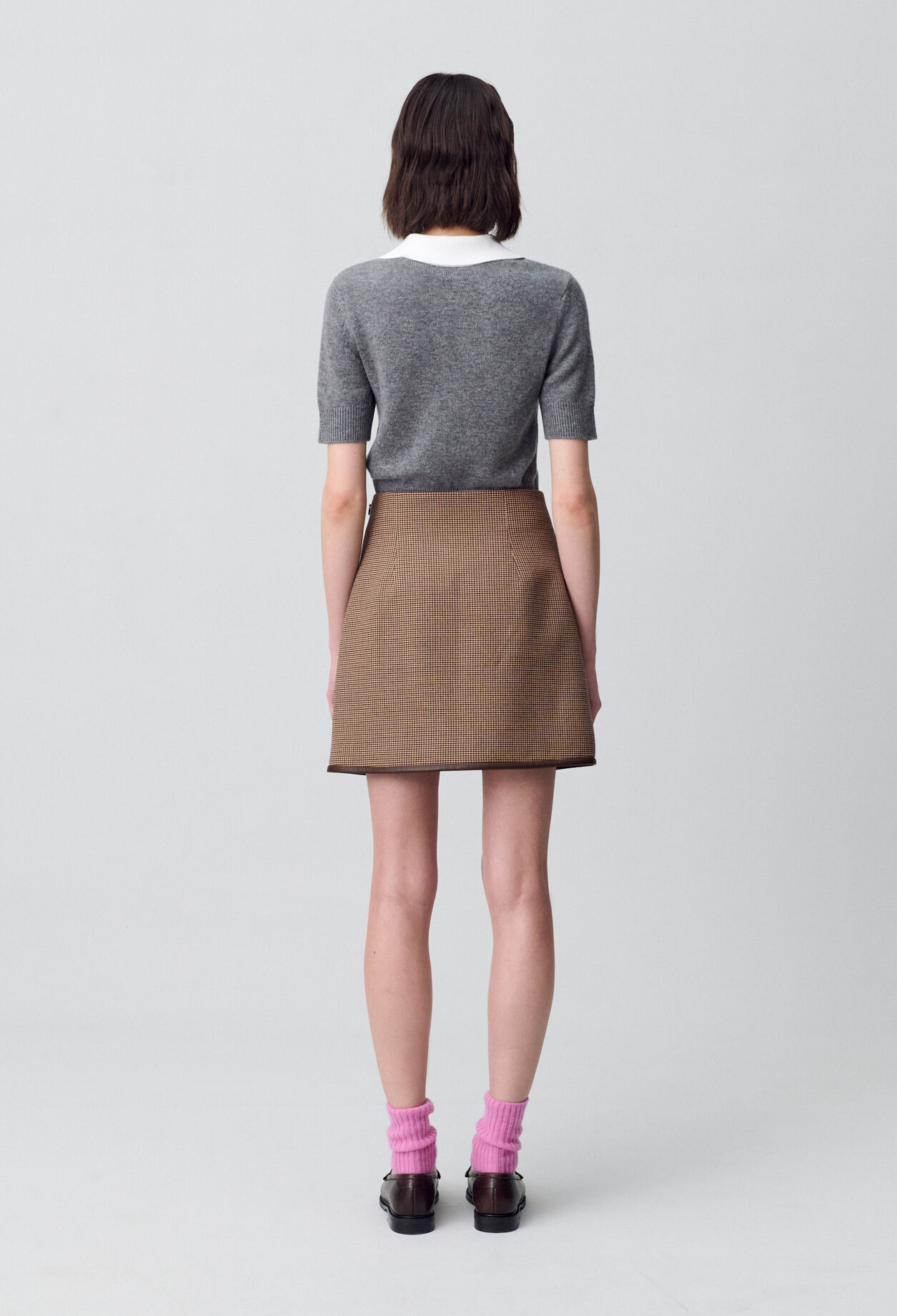 Jupe courte à motifs pied de poule avec patte en faux cuir et coupe droite portefeuille