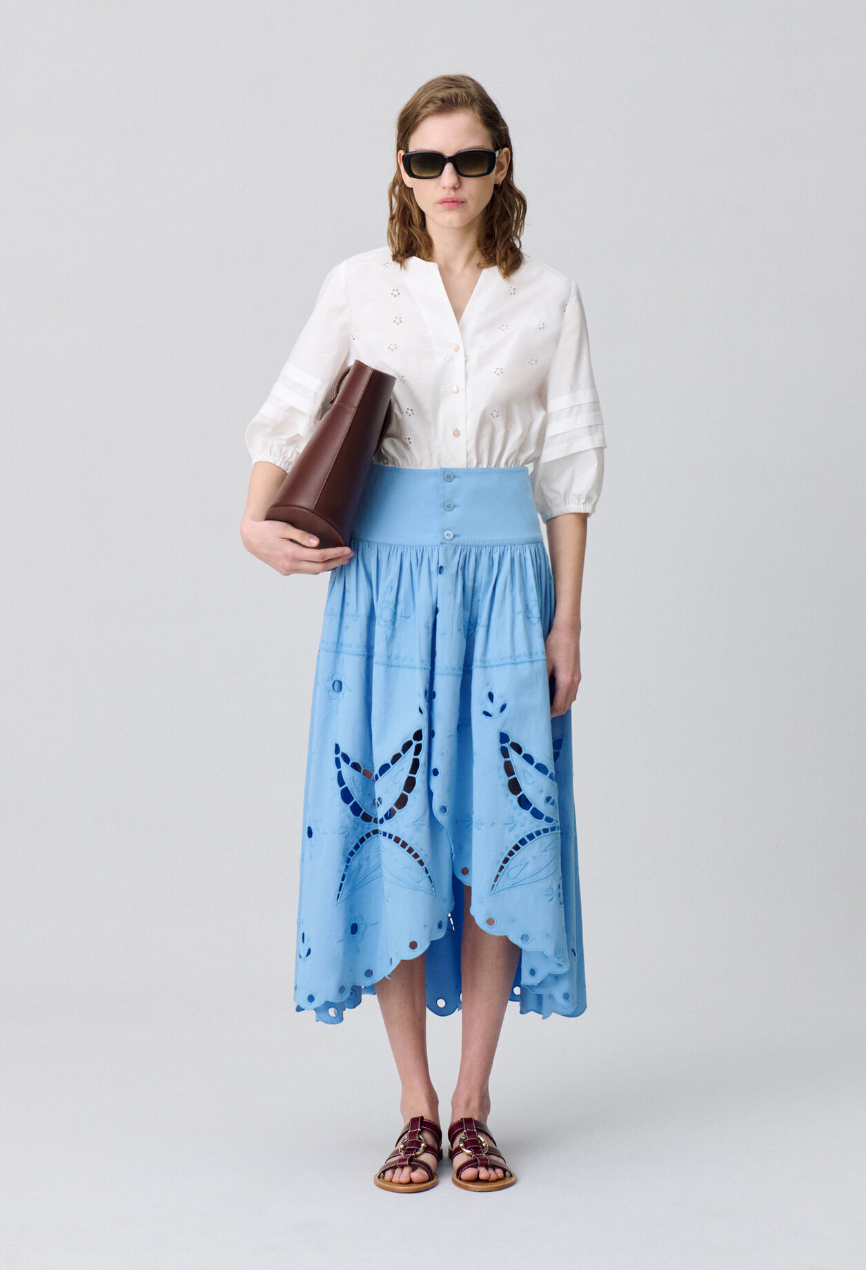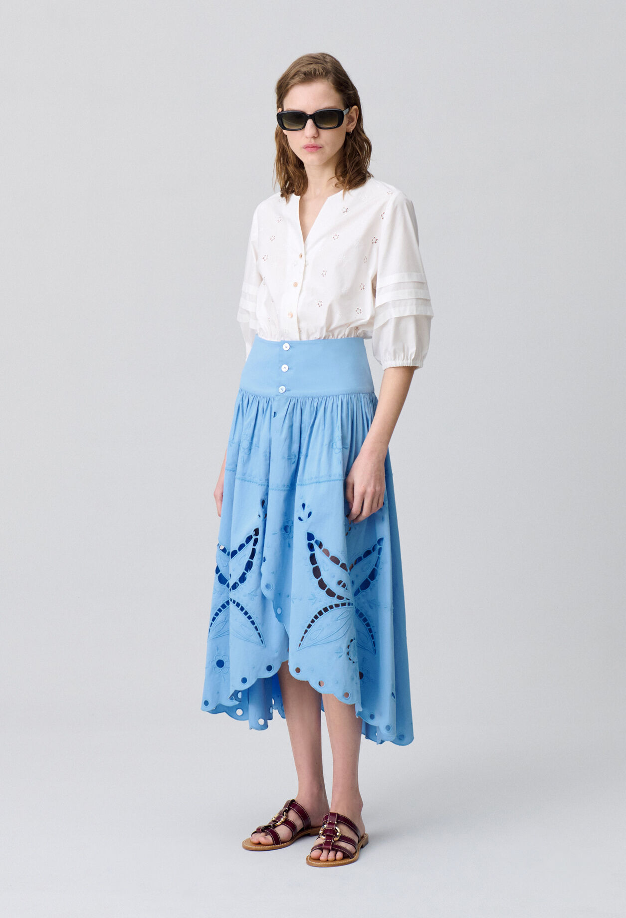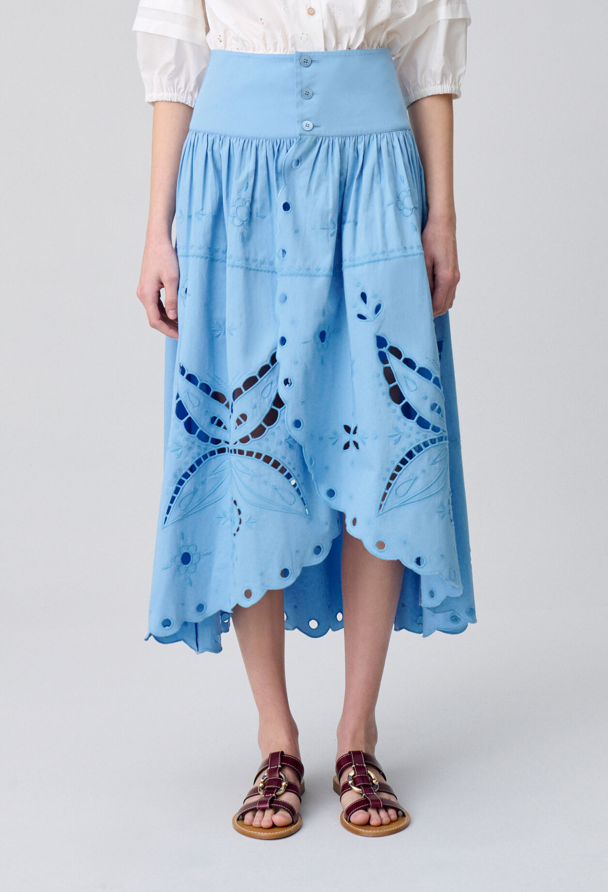 Jupe mi-longue type portefeuille avec basque plaquée à la taille et détails ajourés