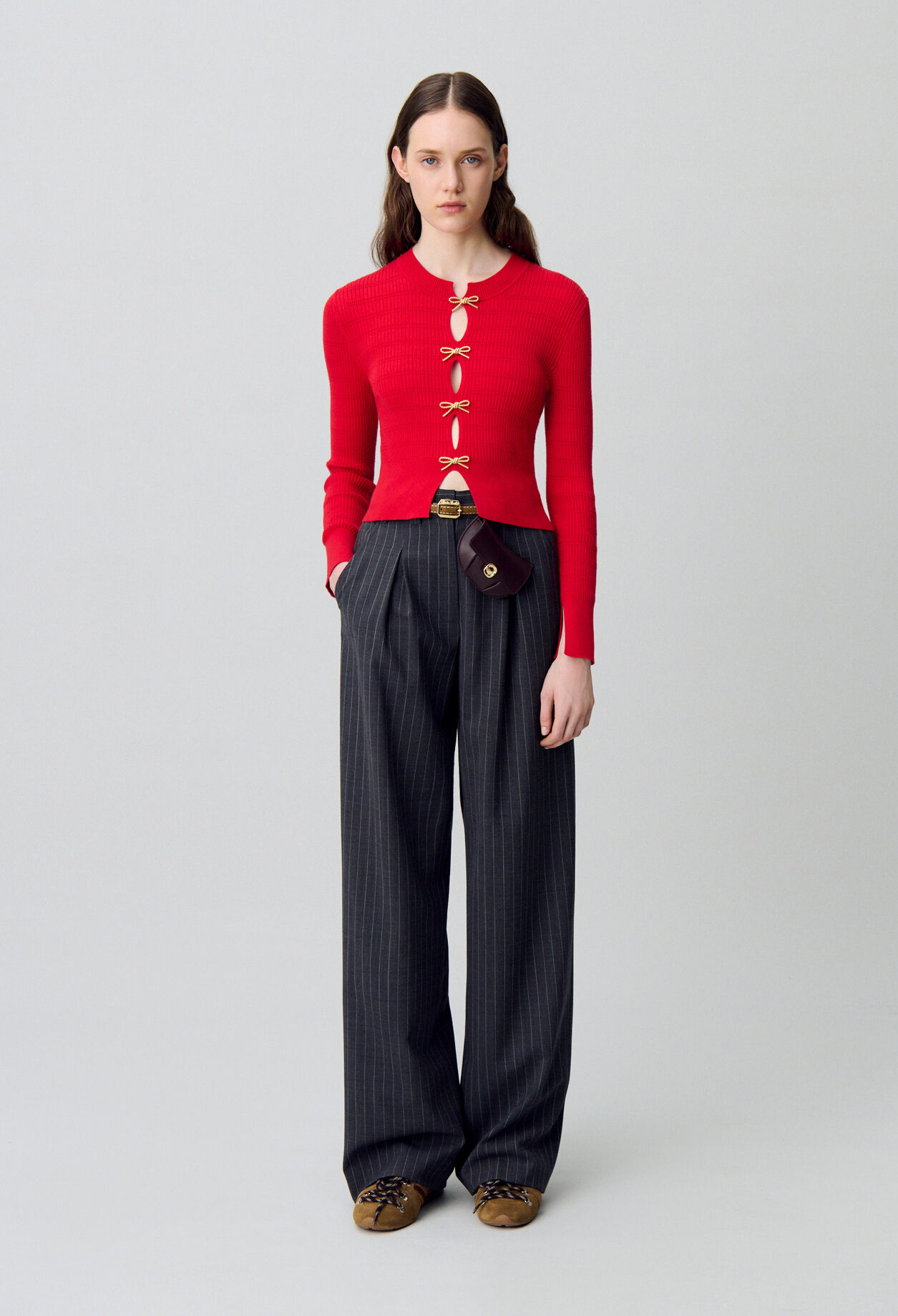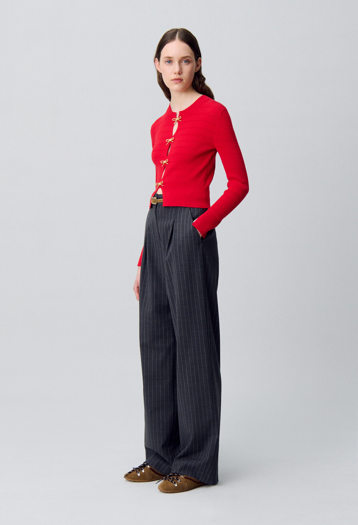 Notre studio s’est inspiré du mouvement Yuppie (Young Urban Professional), emblématique de l’office wear new-yorkais des années 80. Ce vestiaire historiquement masculin a été entièrement réinventé dans une version féminine. Couleurs pastel — parme ou bleu ciel — et détails espiègles, comme le bouton bijou, composent une silhouette qui mêle codes formels et esprit casual.