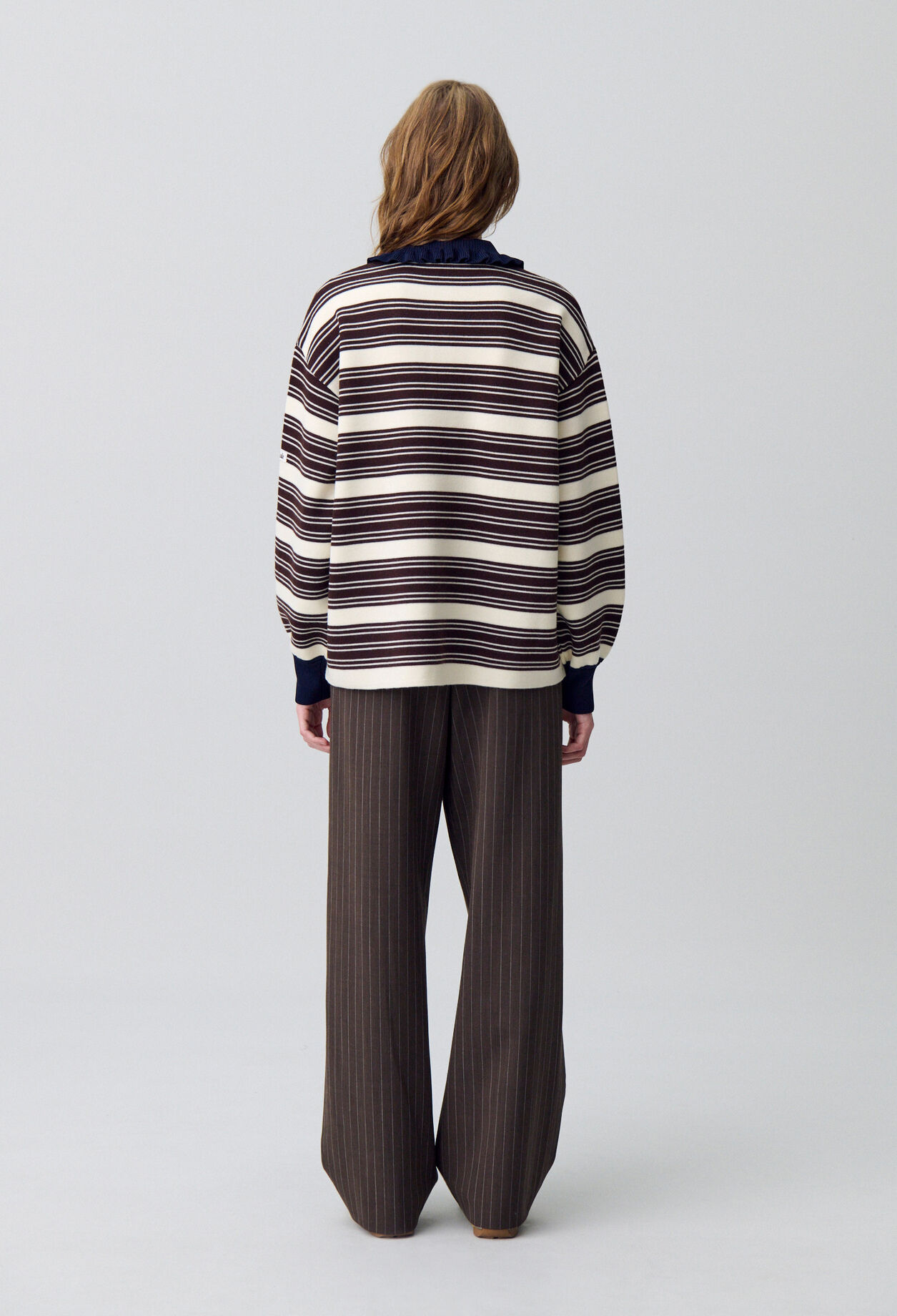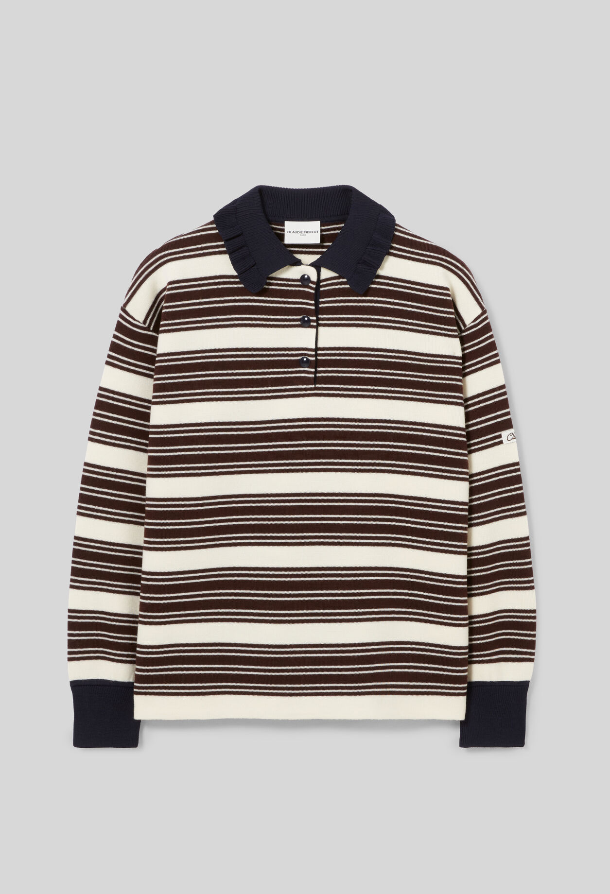 Pull type polo rugby en maille à manches longues et col contrasté à volants