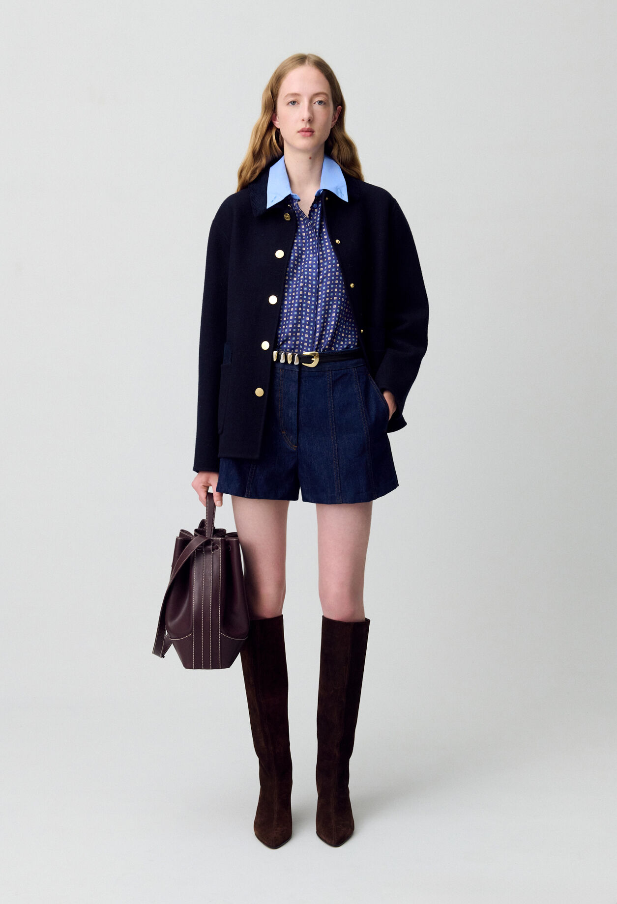 Notre studio rend hommage à deux figures féminines des années 50 et 60 — Florence Knoll, architecte visionnaire, et Rosie la riveteuse, icône de la culture populaire — avec des tenues à la fois fonctionnelles et affûtées. Combinant le style preppy et workwear, nous avons imaginé des tenues hybrides, comme un tailleur en cuir patiné ou une robe chasuble à motif pied-de-poule, avec des coupes épurées qui mettent en valeur les détails de boutonnage.