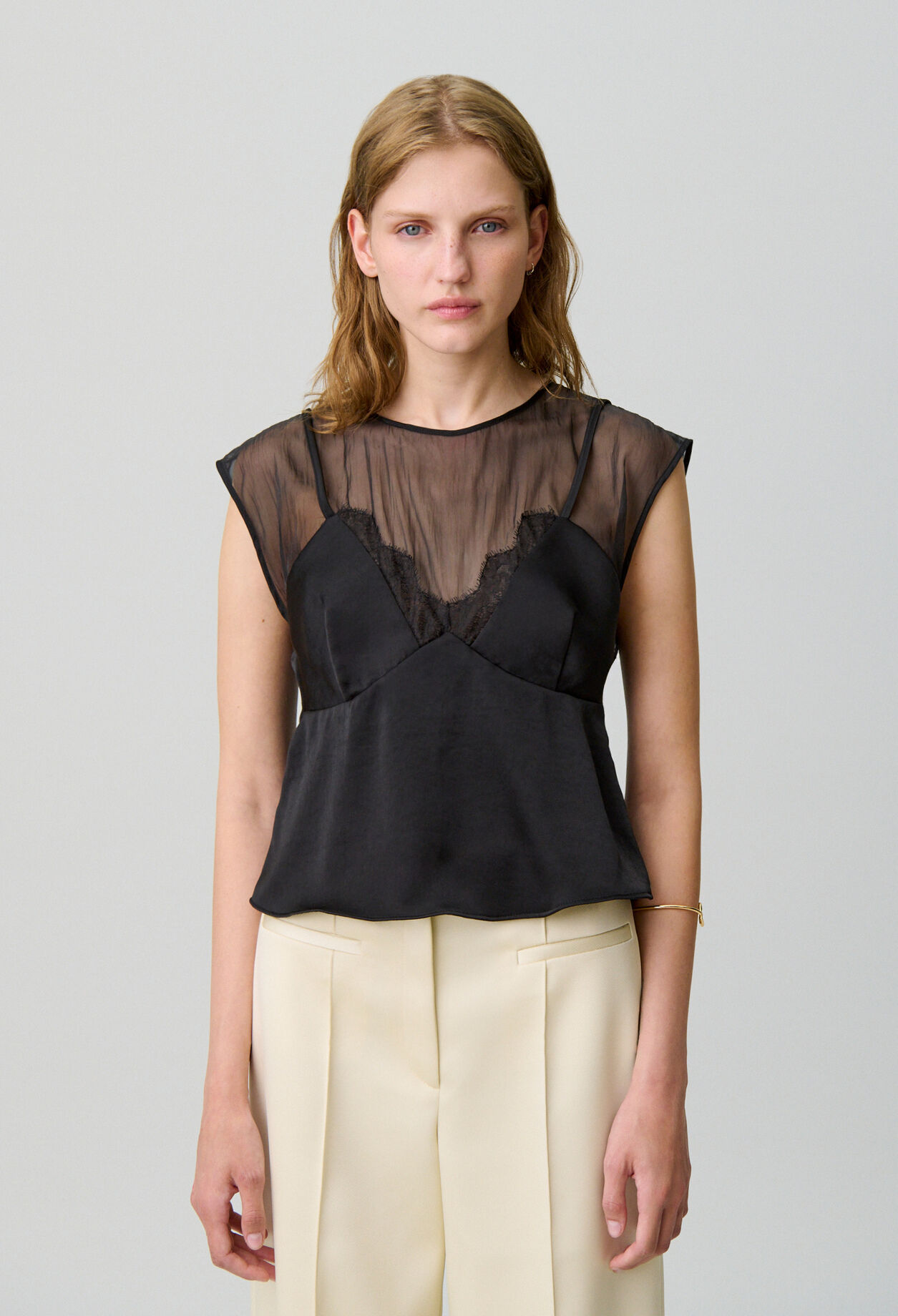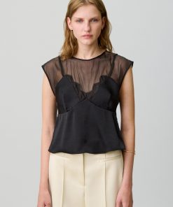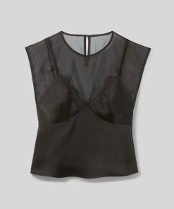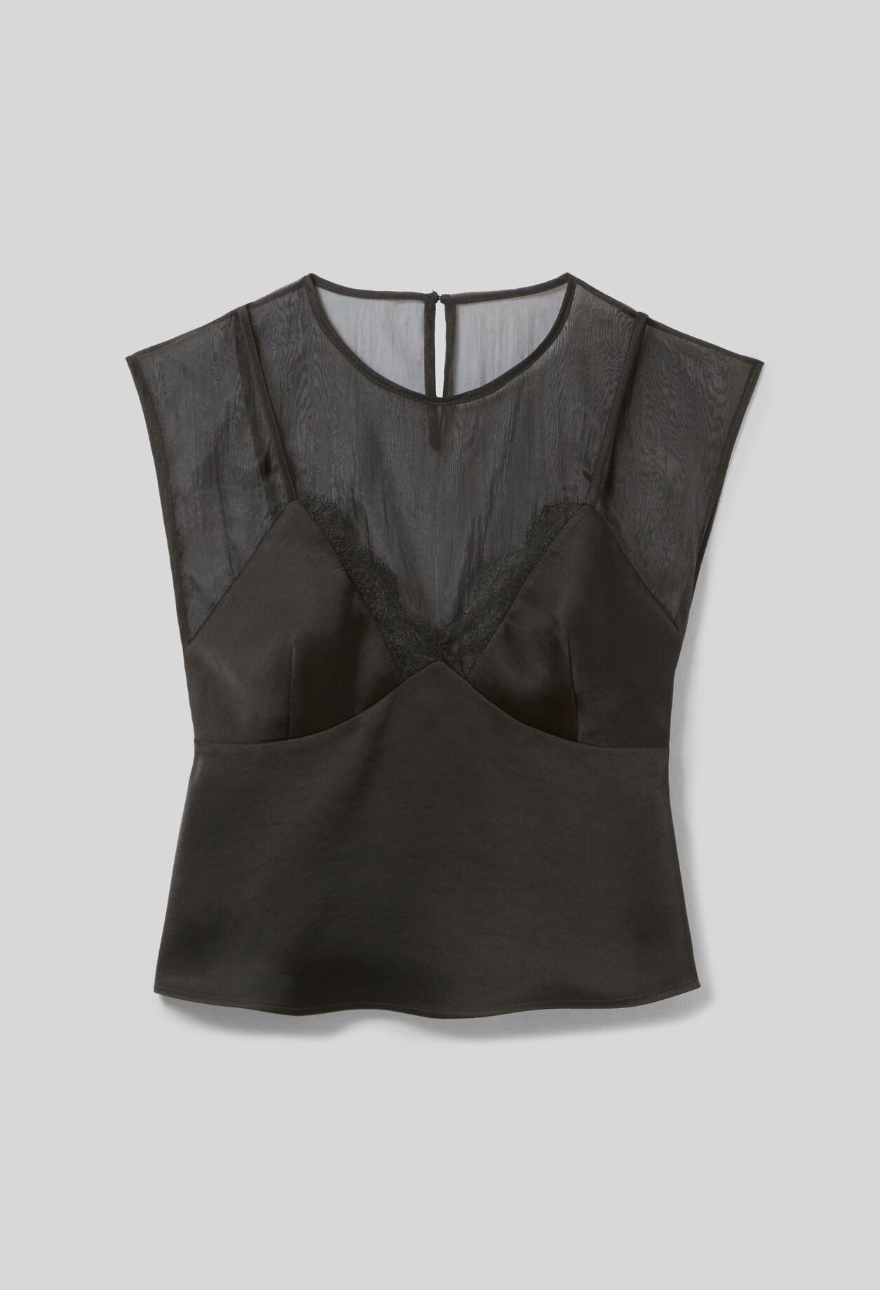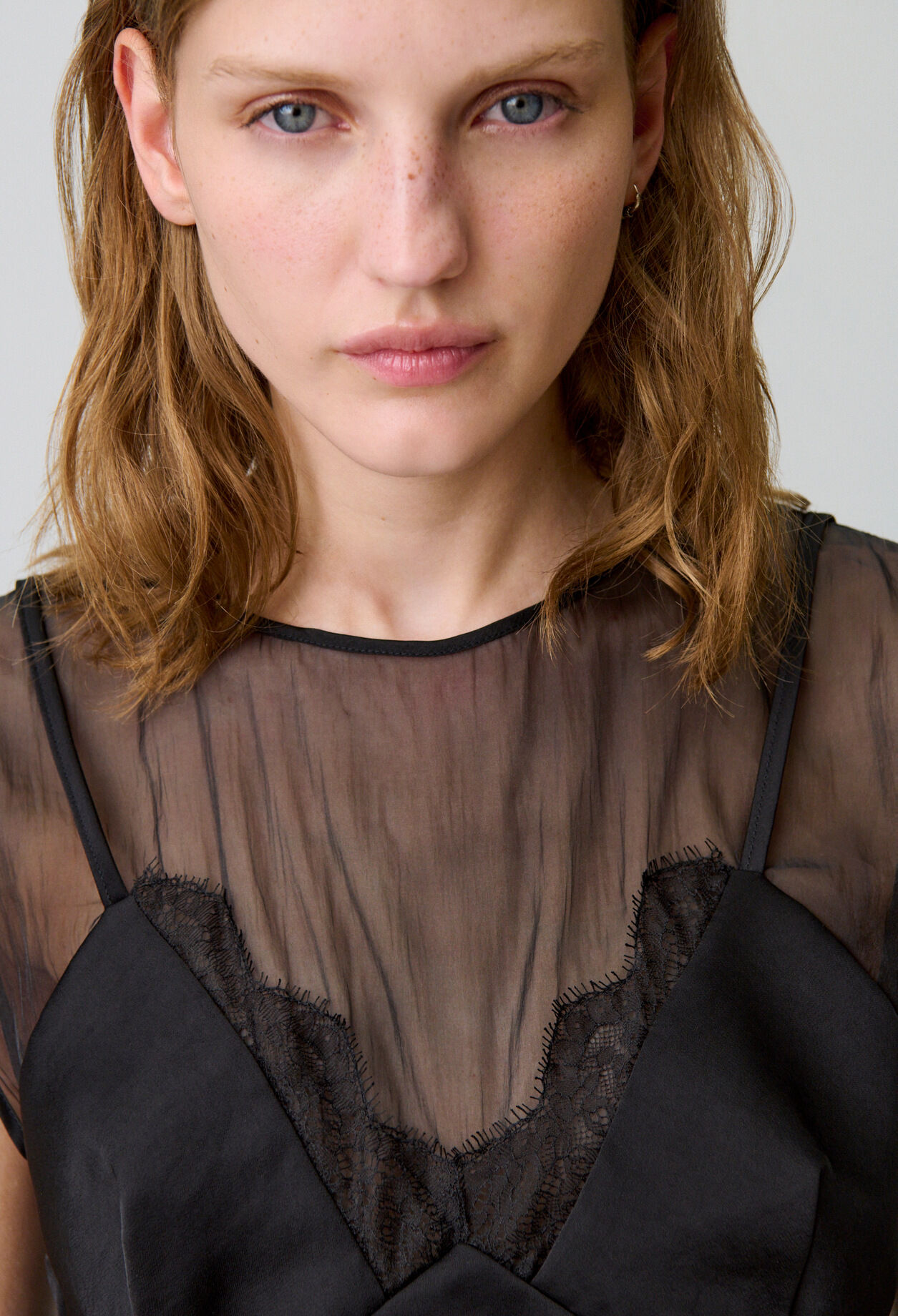 Top fluide sans manches avec empiècement en tissu type organza et détails de dentelle