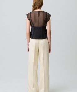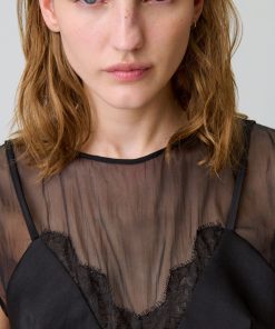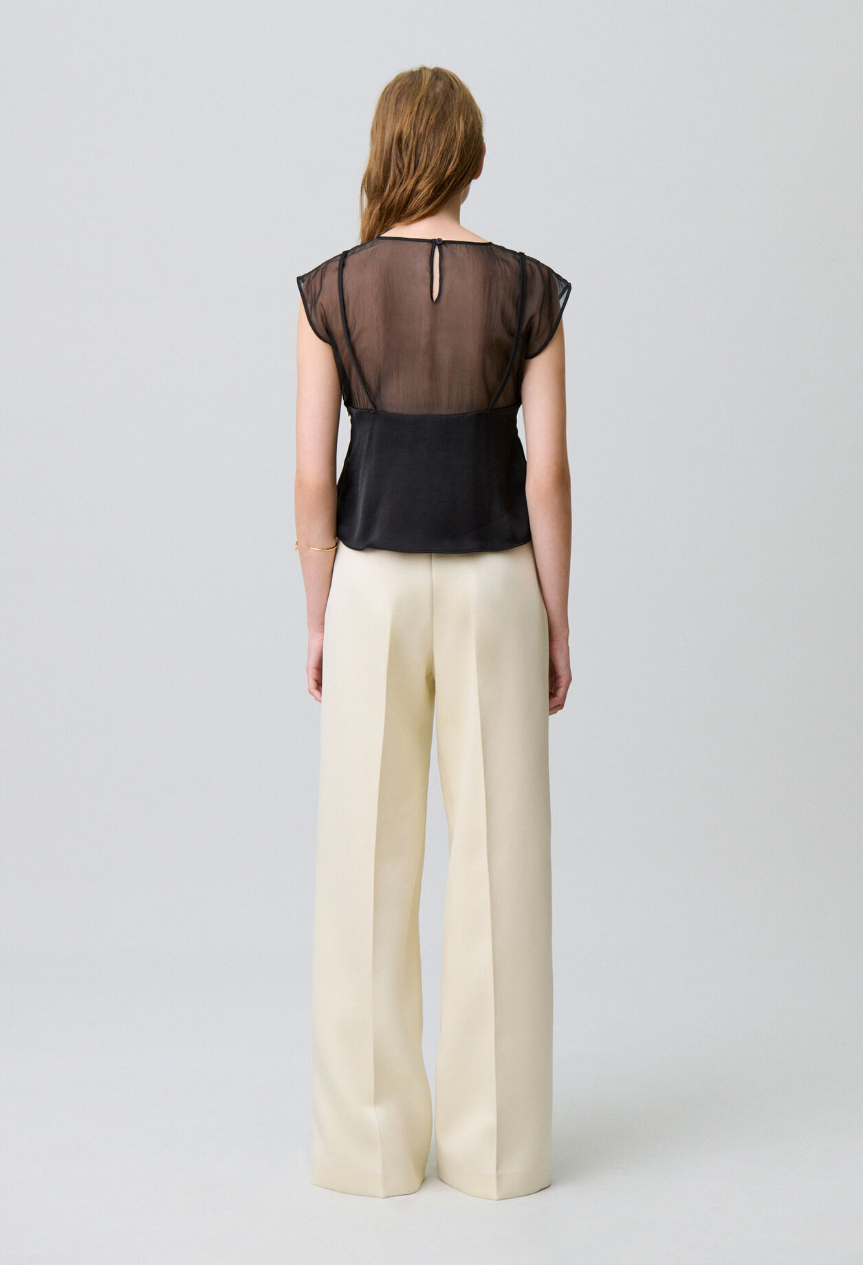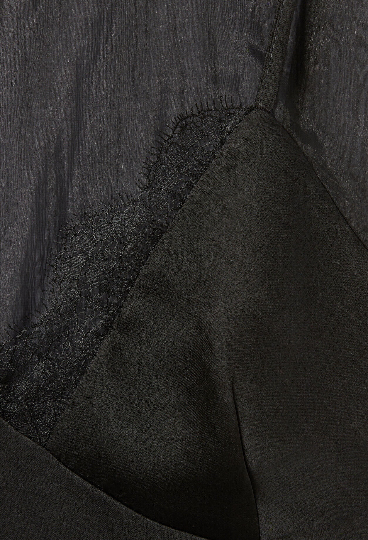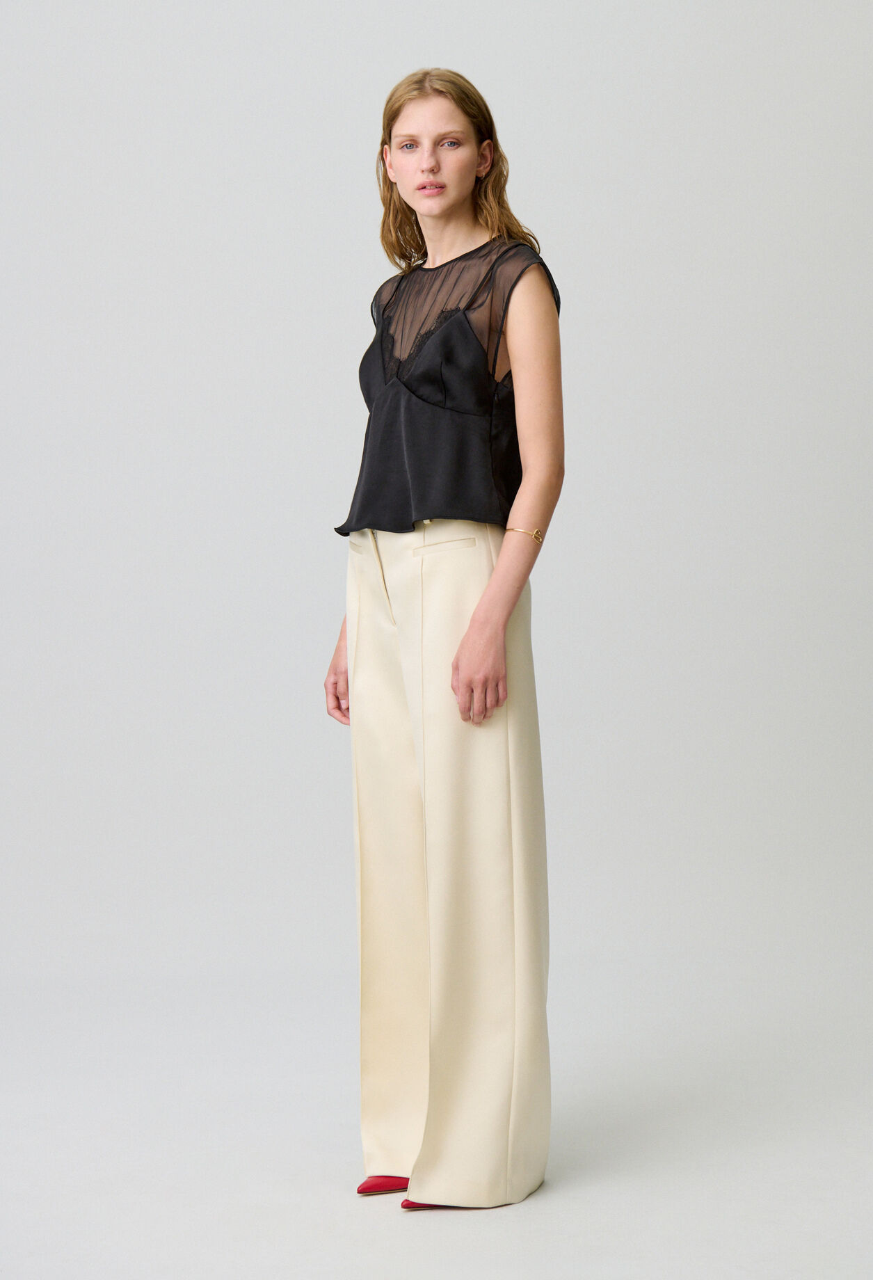 Top fluide sans manches avec empiècement en tissu type organza et détails de dentelle