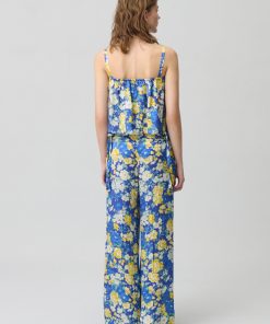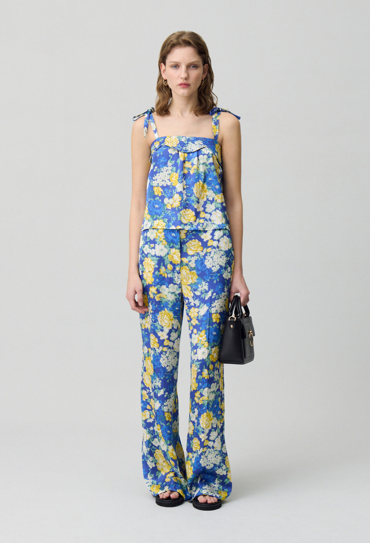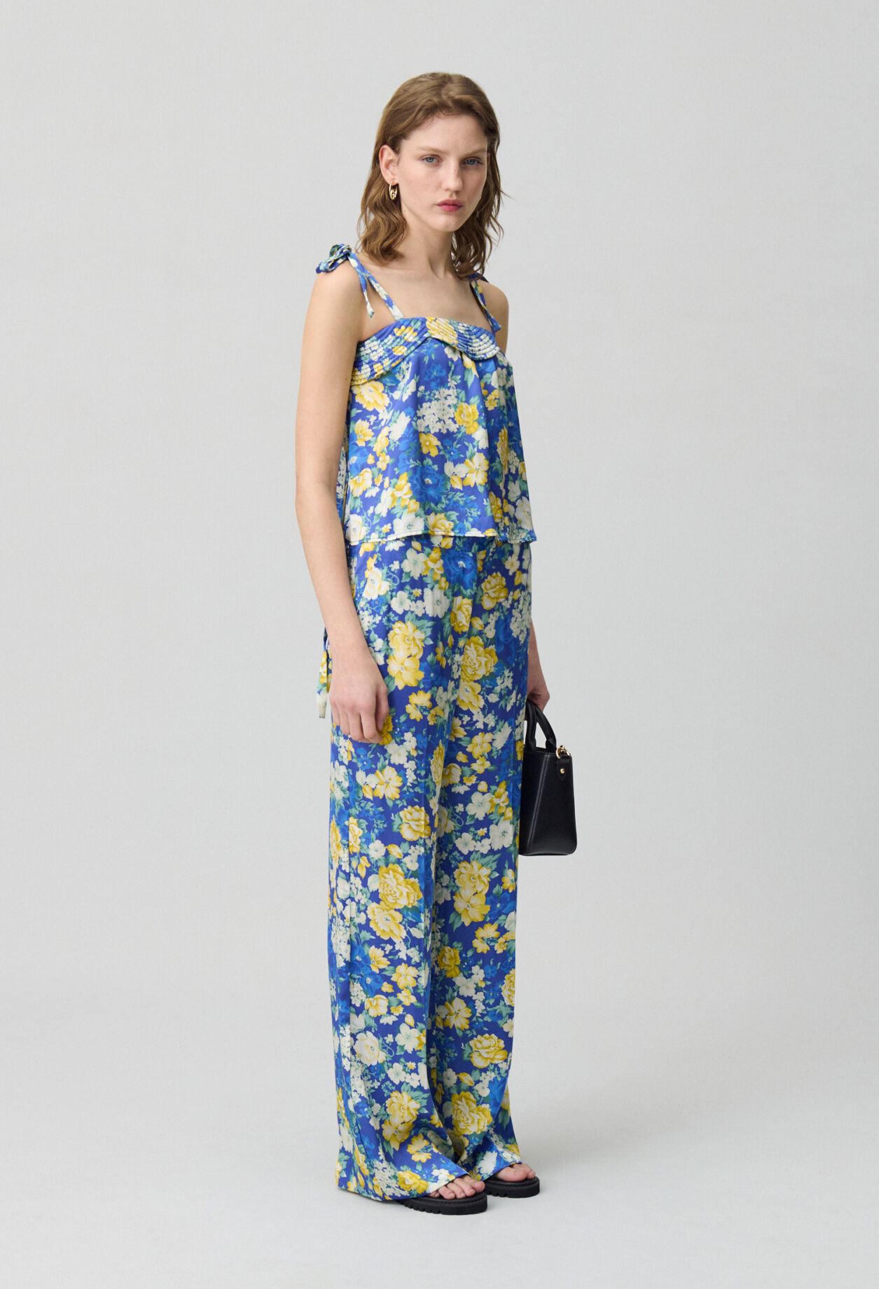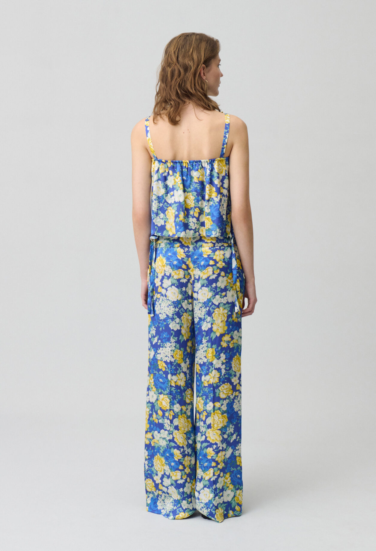 Top à imprimé floral satiné avec décolleté droit et bretelles larges à nouer
