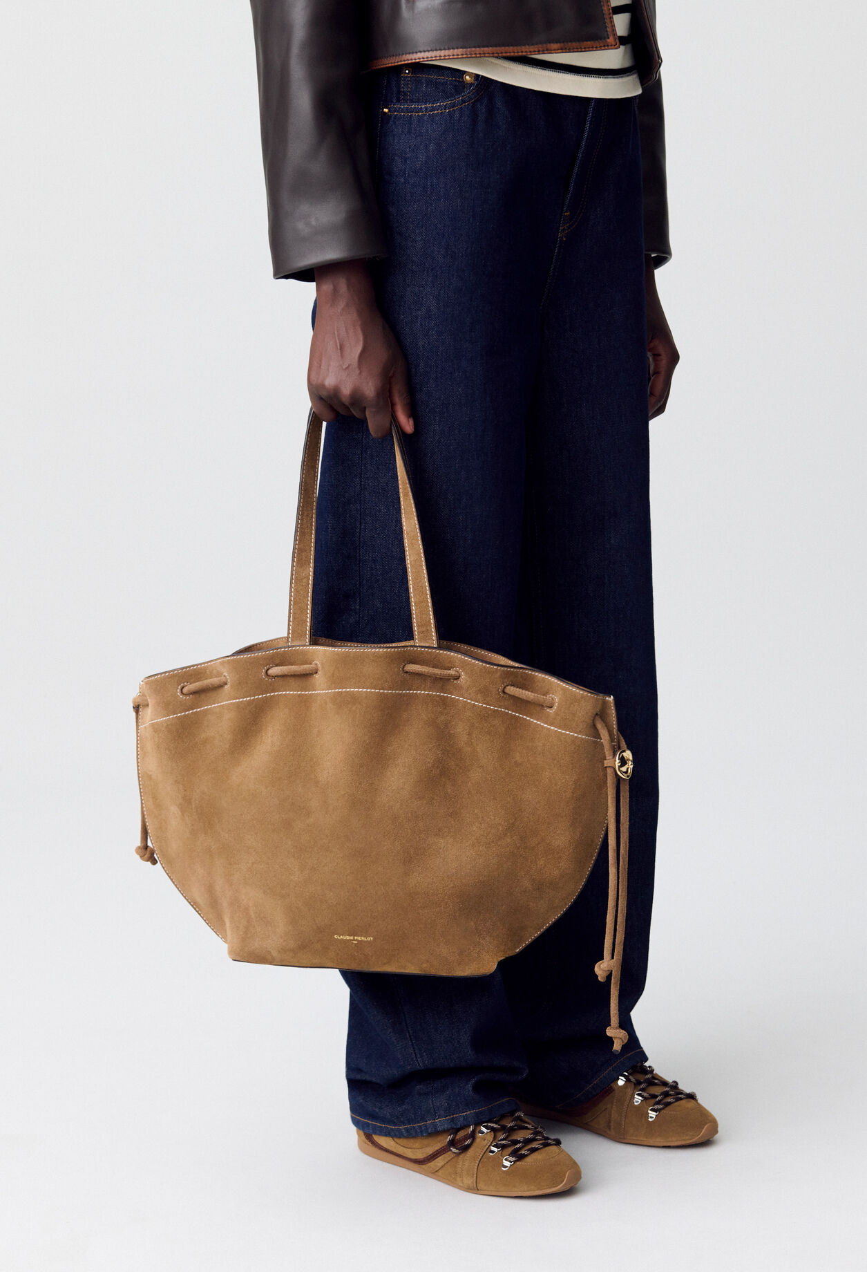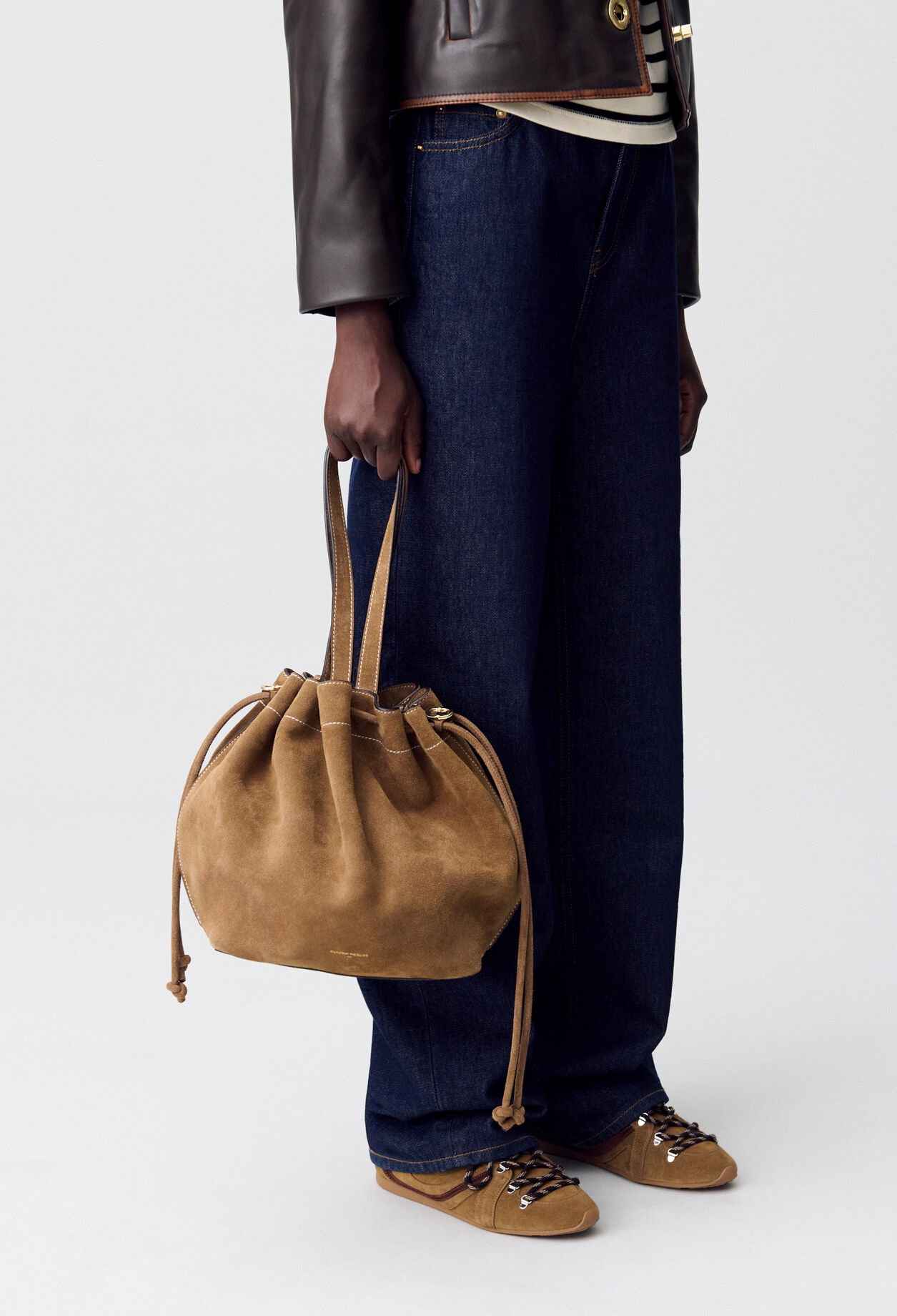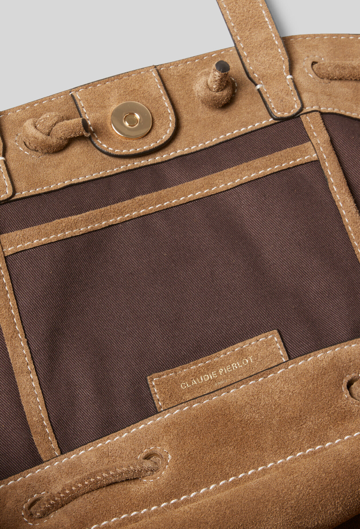 Cabas en cuir souple suède avec fermetures par cordon et aimant et surpiqures contrastées