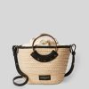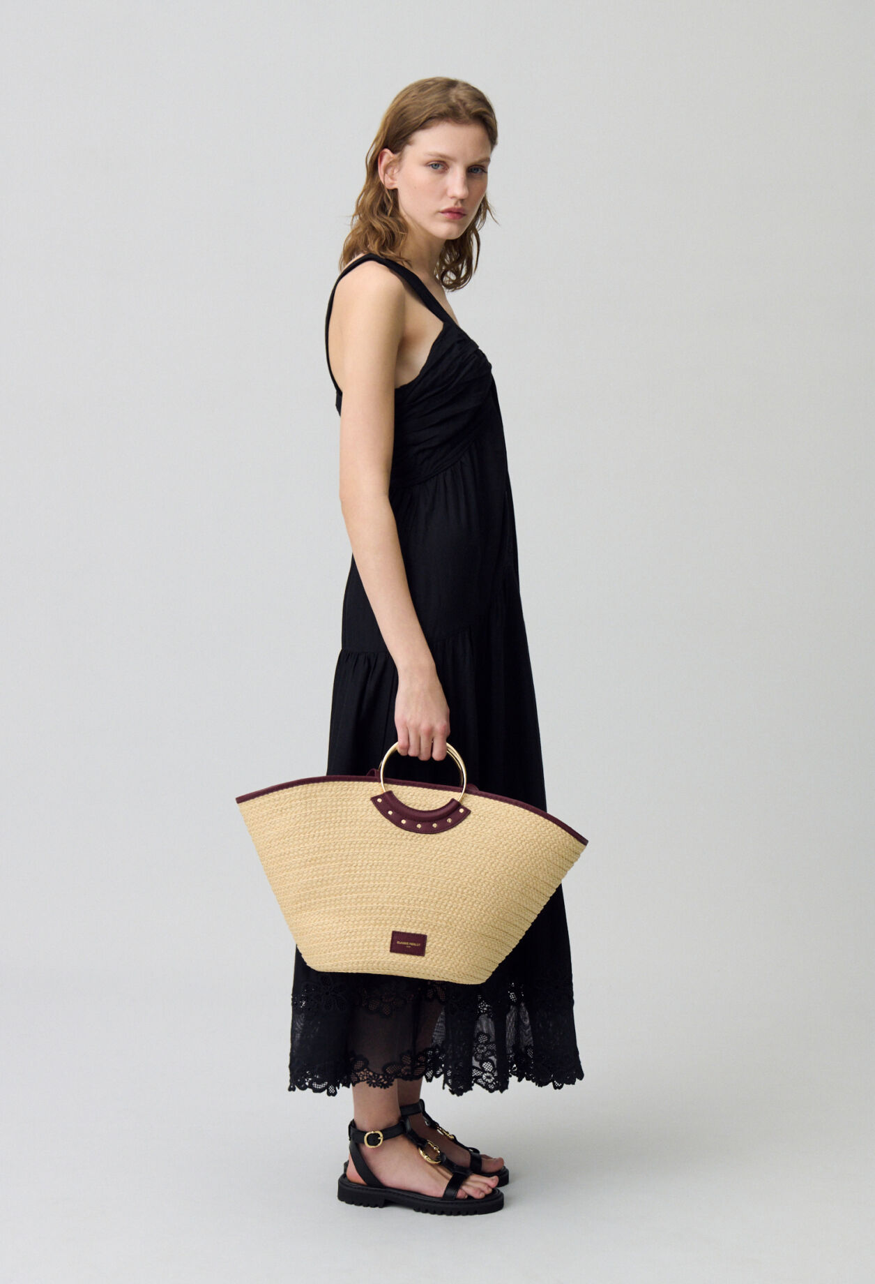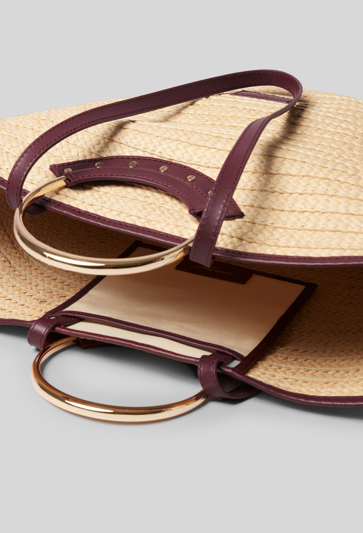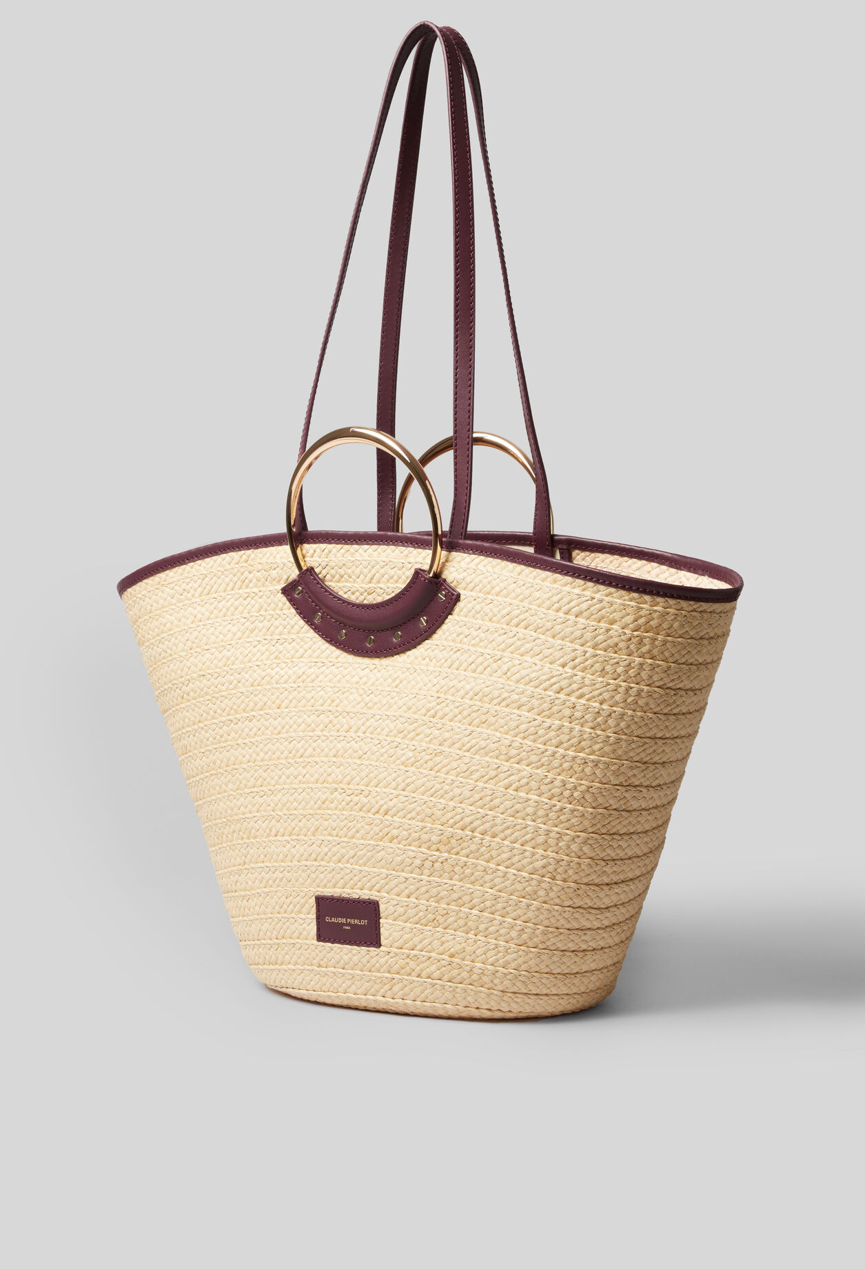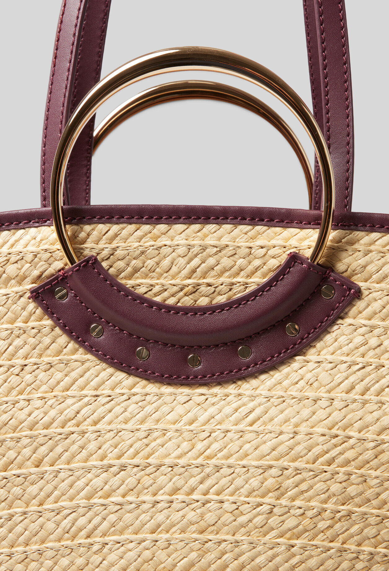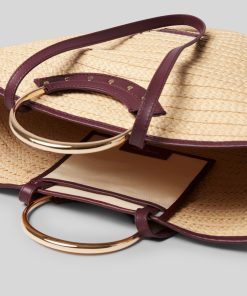 Panier en raphia tressée avec anneaux asymétriques et détails cloutés